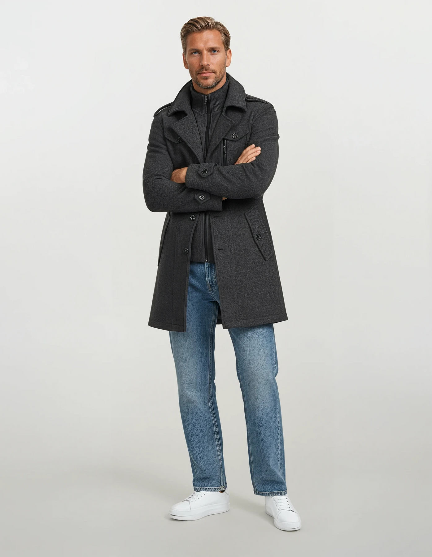 Friedrichs zweiteiliger Mantel ist mehr als nur ein Kleidungsstück, er ist ein Statement für Stärke und zeitlose Eleganz. Dieser Mantel kombiniert traditionelle Designs mit modernem Schnitt und schafft so ein Meisterwerk.